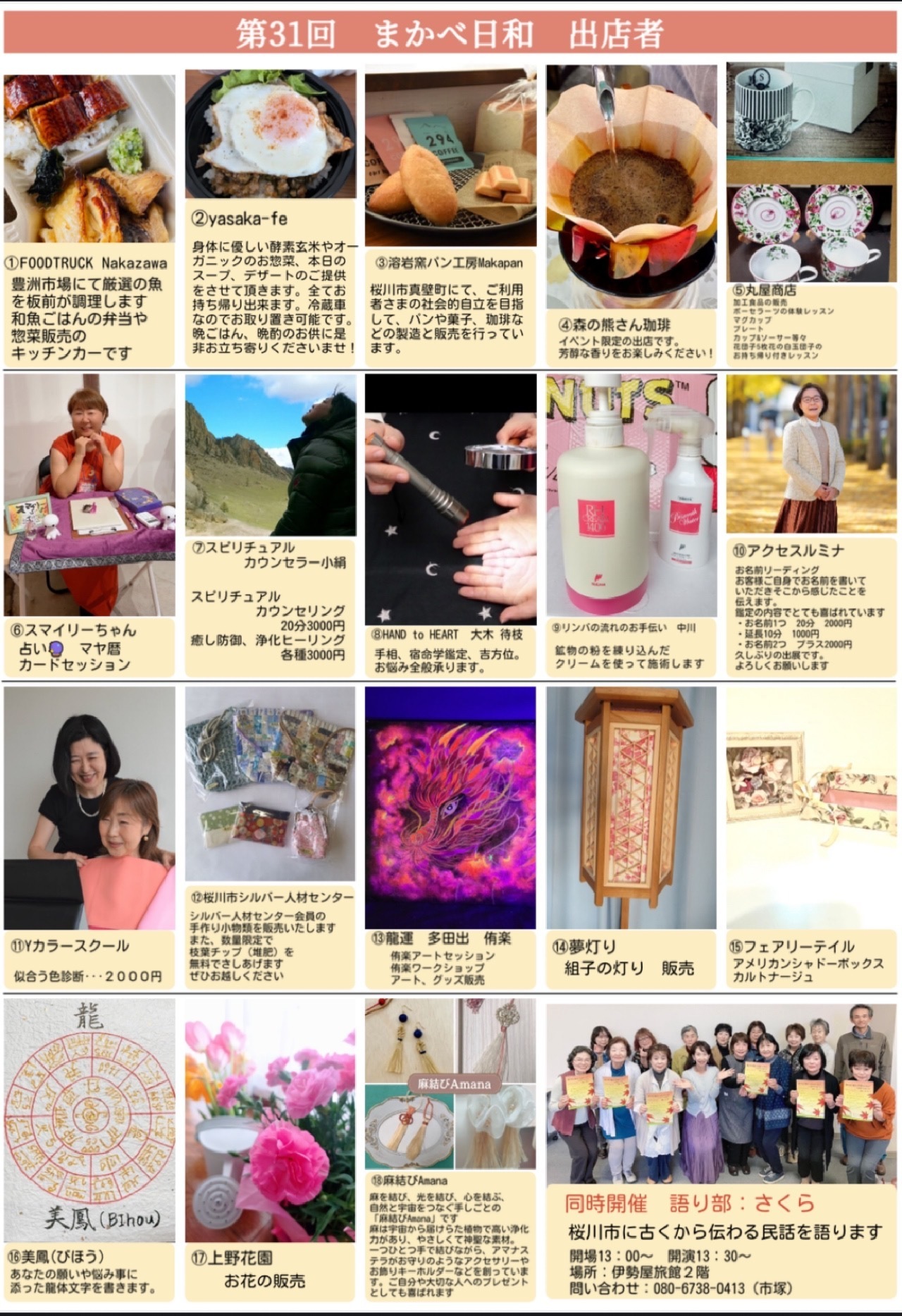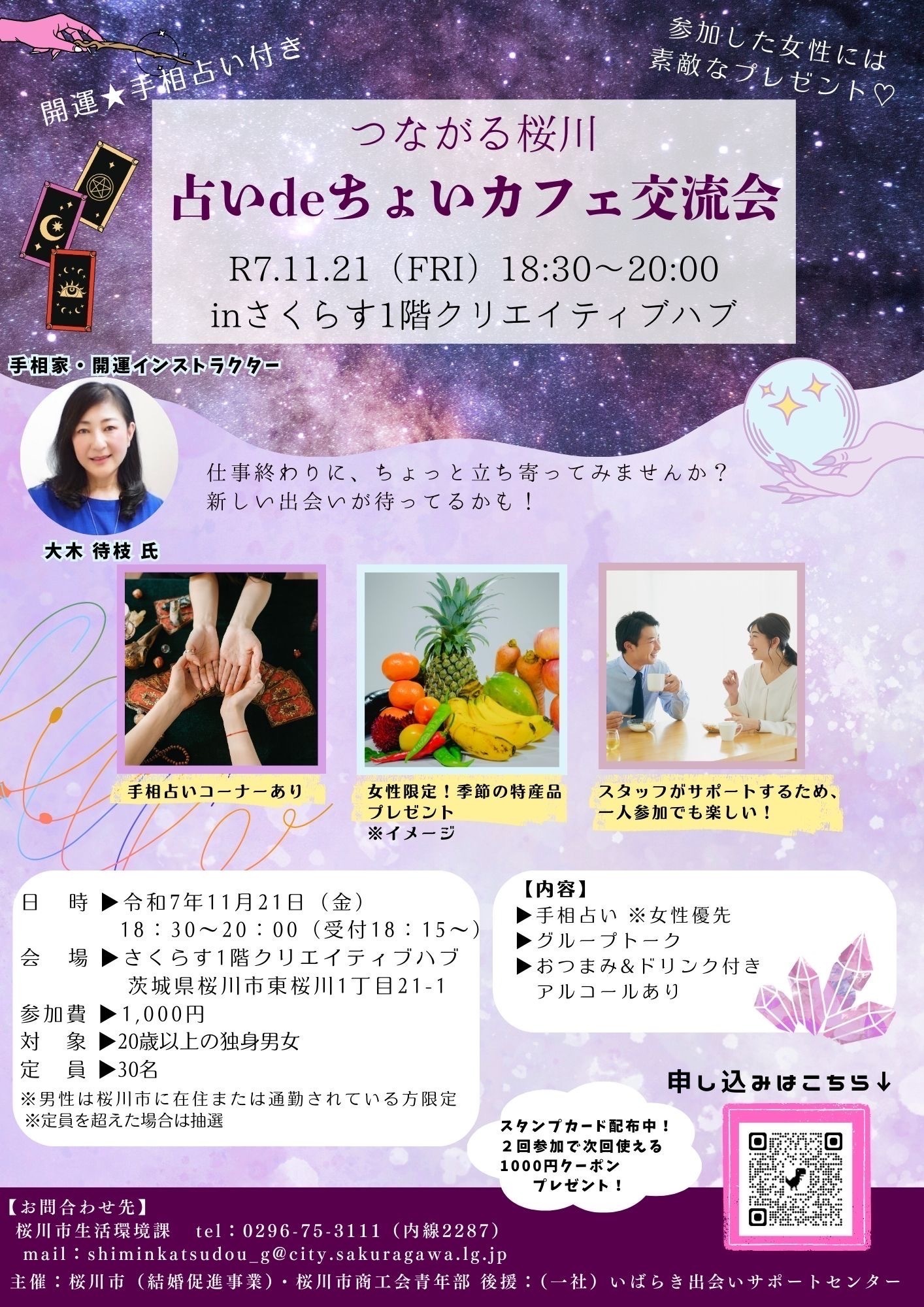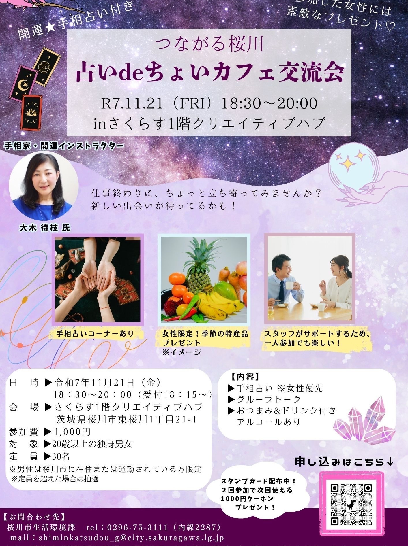 2025.11.16 まかべ日和 まるでタイムスリップしたかのような懐かしい街並みの真壁。普段は静かな下宿通りにいろいろなお店が出店し、賑やかな通りになります。手作りデザート、お弁当、ハンドメイド品など、ぜひお立ち寄りください。10:00~15:00 雨天決行会場 桜川市真壁町の下宿通り駐車場 高上町(たかじょうまち)駐車場・無料 2025.11.21占いdeちょいカフェ交流会 CONTACT 大木待枝 手相鑑定所 HAND to HEART 茨城 手相鑑定・占い 090-4833-7074 メールはこちら ご予約・お問い合わせ 鑑定カレンダーはこちら HOME | イベント